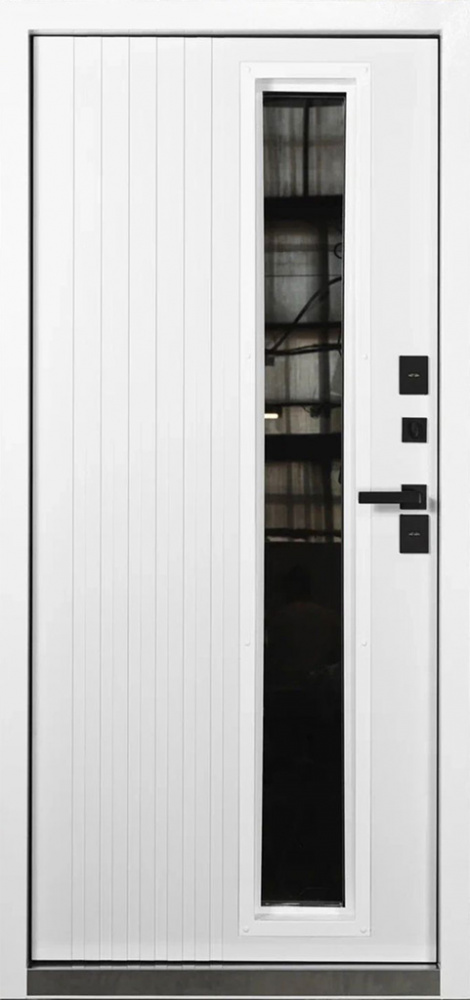 Отделка: Объемный металлический рисунок, окраска «МУАР AKZO NOBEL RAL 7024» + цинкогрунт «AKZO NOBEL» / окраска внутреннего короба и рамки полотна белая, 16 мм фрезерованная МДФ панель «белый мат., серия U полипропилен»