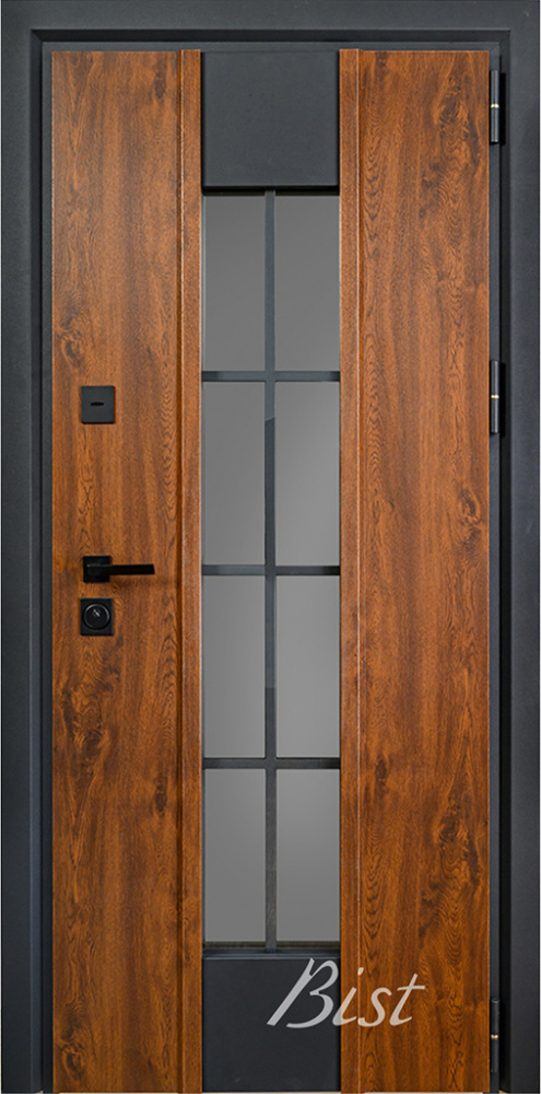 – Отделка снаружи: Оцинкованный лист (не грунт) с ламинацией Дуб темный + Стеклопакет 3х камерный (4 стекла) с металлической решёткой.